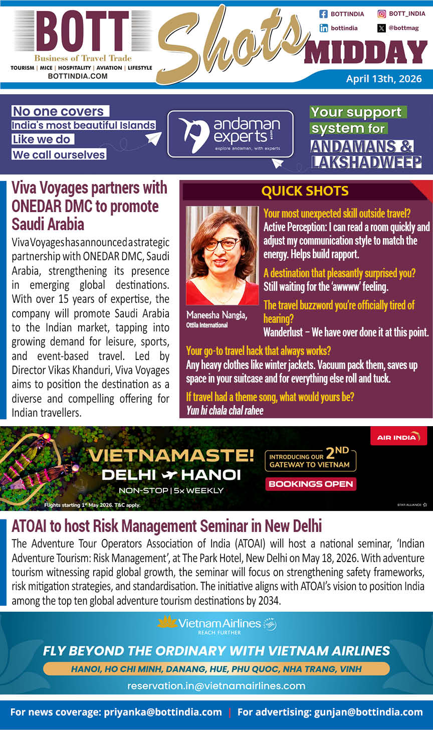 The Adventure Tour Operators Association of India (ATOAI) will host a national seminar, ‘Indian Adventure Tourism: Risk Management’, at The Park Hotel, New Delhi on May 18, 2026. With adventure tourism witnessing rapid global growth, the seminar will focus on strengthening safety frameworks, risk mitigation strategies, and standardisation. The initiative aligns with ATOAI’s vision to position India among the top ten global adventure tourism destinations by 2034.