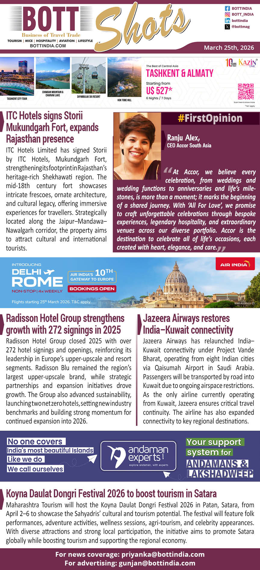 ITC Hotels Limited has signed Storii by ITC Hotels, Mukundgarh Fort, strengthening its footprint in Rajasthan’s heritage-rich Shekhawati region. The mid-18th century fort showcases intricate frescoes, ornate architecture, and cultural legacy, offering immersive experiences for travellers. Strategically located along the Jaipur–Mandawa–Nawalgarh corridor, the property aims to attract cultural and international tourists.