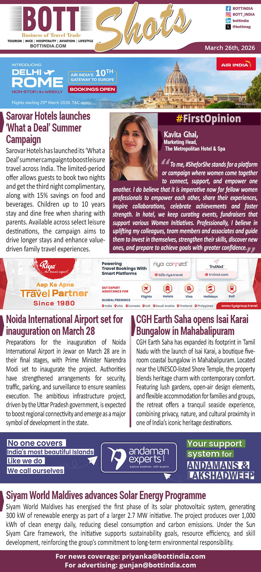 Sarovar Hotels has launched its ‘What a Deal’ summer campaign to boost leisure travel across India. The limited-period offer allows guests to book two nights and get the third night complimentary, along with 15% savings on food and beverages. Children up to 10 years stay and dine free when sharing with parents. Available across select leisure destinations, the campaign aims to drive longer stays and enhance value-driven family travel experiences.