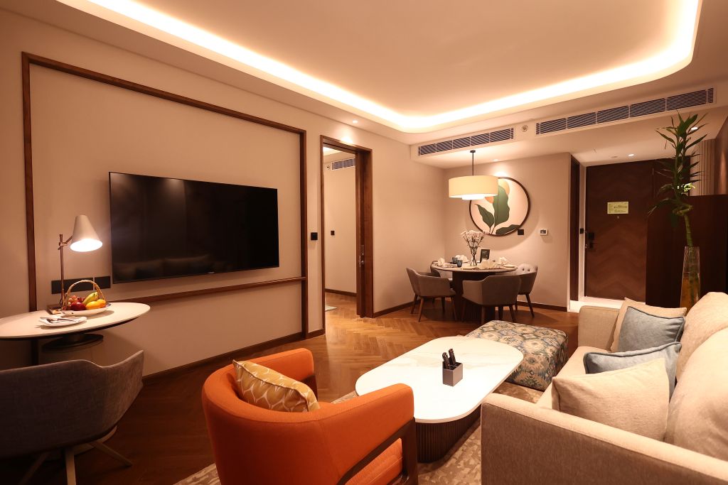 The interiors of the suites showcase Belgian hardwood flooring, lending a natural warmth and timeless quality to the spaces. Spacious living areas include a separate living room and a dining section, designed for indulgence, comfort and relaxation. The spacious bedrooms are thoughtfully designed that offer a comfortable seating area where guests can relax while enjoying sweeping city views. For enhanced comfort and sustainability, the suites are equipped with advanced energy-efficient air-conditioning systems, ensuring optimal climate control while reducing environmental impact.