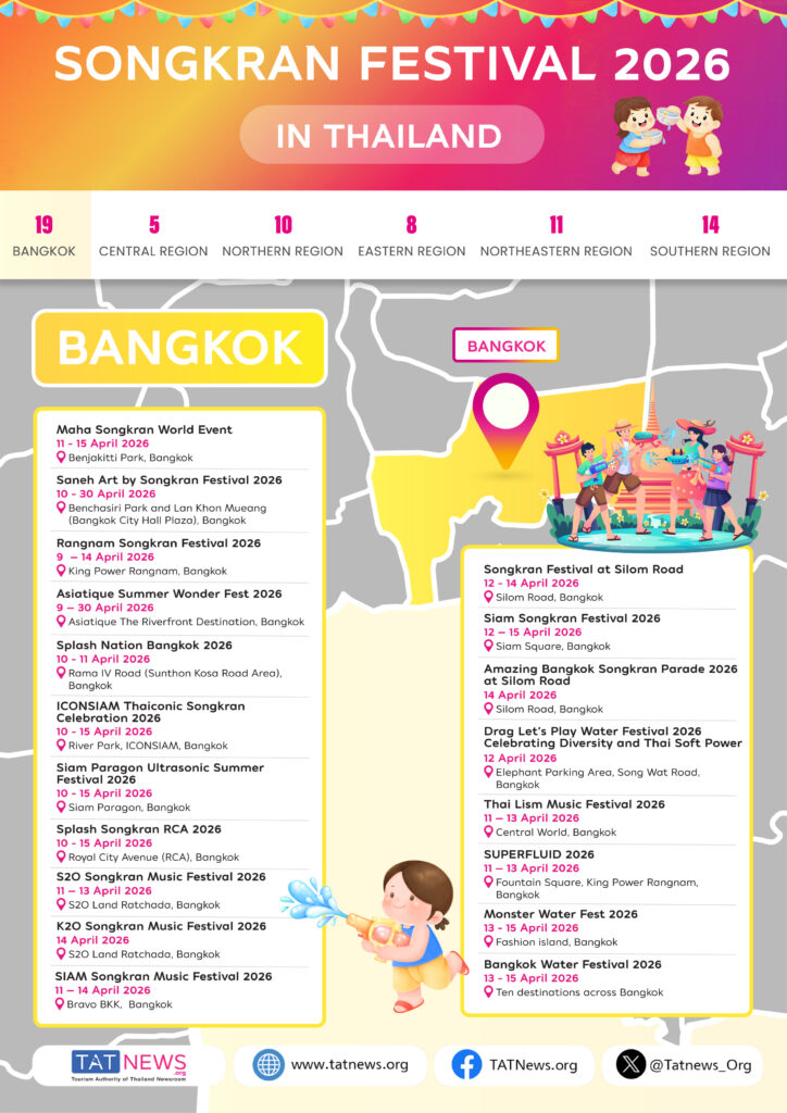 In Bangkok, large-scale events from 9 to 15 April will include the Maha Songkran World Event at Benjakitti Park, riverside celebrations at ICONSIAM and Asiatique, and music festivals such as S2O and Siam Songkran. Silom and Siam Square will once again transform into major water celebration zones.
