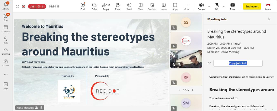 Speaking about the webinar, Leena Jhugroo, Managing Director, Travel Lounge Leisure & Tours, and Prabhakar Kamat, Business Head, Red Dot Representations, jointly said, “The webinar gave us an opportune platform to showcase Mauritius as a destination with immense potential to attract travellers of varying segments. Given the global traveller profile growing exponentially across categories, presenting depth, diversity, and authenticity remains central to every travel destination, and Mauritius holds the potential to deliver it on all fronts when positioned mindfully.”
